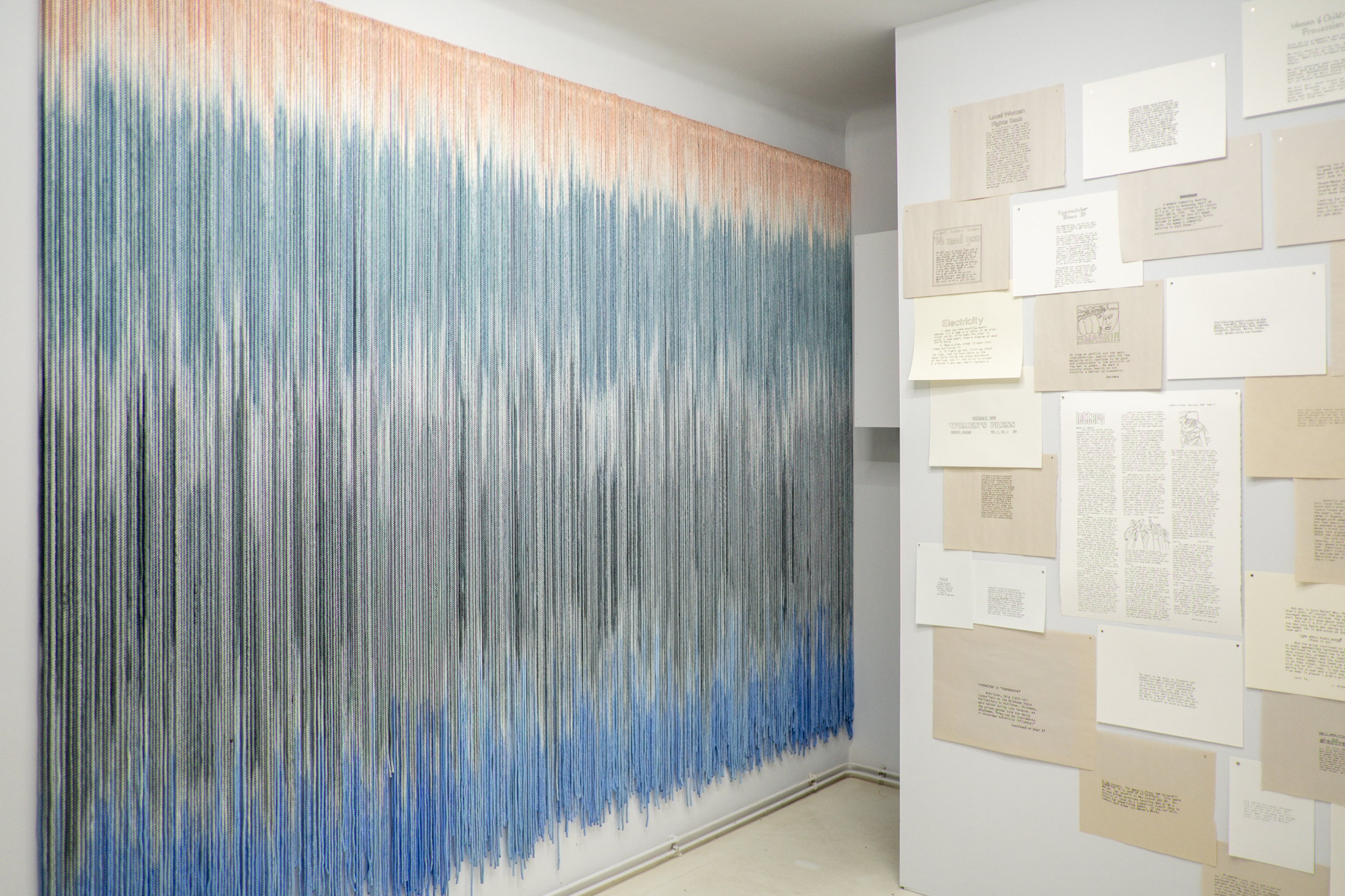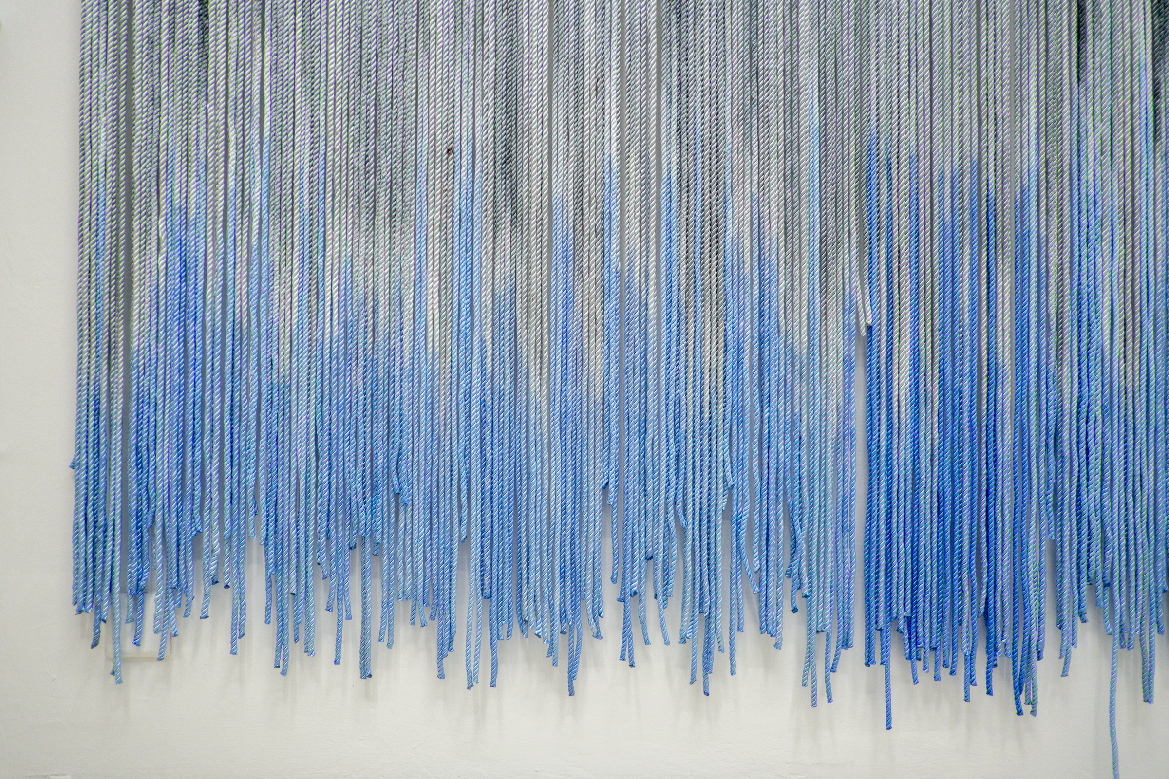 The main focus of many of Terese Kasalicky’s works in the past few years is the rope either in form of curtains or as sculptures in the room. The rope as a common part of our everyday lives. Its main job is to connect, bring together, or weave things—like a living line. Curtain #2 was made especially for the Size Matters exhibition space, it extends the space, shimmers, conceals and reveals. It enters into a dialog with the black and white works of Kaucyila Brooke. In the “Ropes” series, Kasalicky creates modular sculptures using dyed ropes and sometimes curved stainless steel tubes. One of these sculptures, Bending Ropes #2, is currently on display in Gallery 3 in Schleifmühlgasse. Inspired by art history and visual cues, it represents connection and unity, weaving together to create a flowing whole, much like rivers cascading.