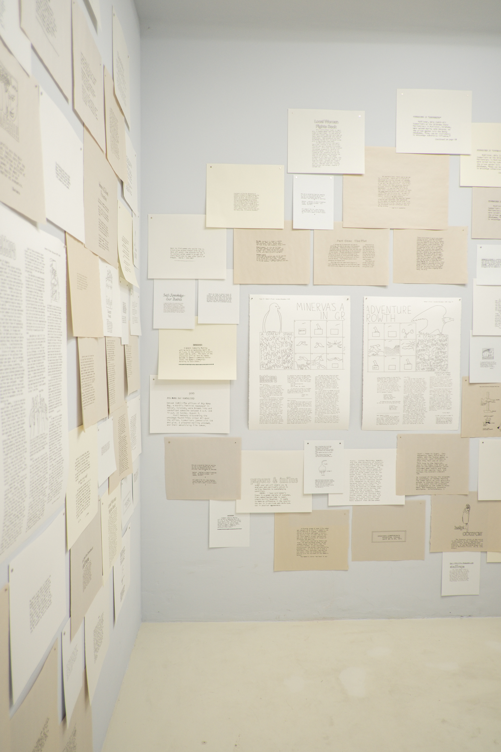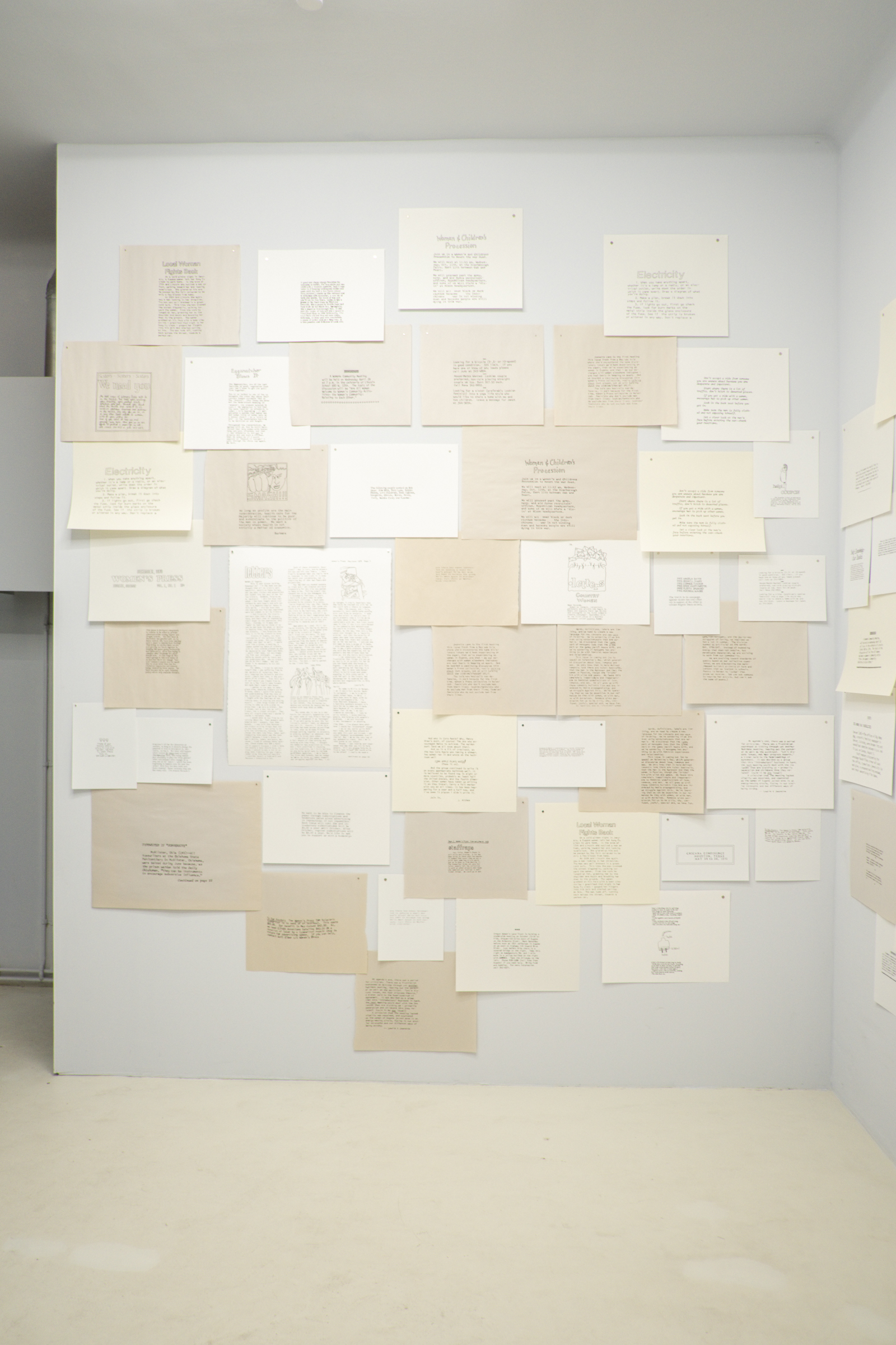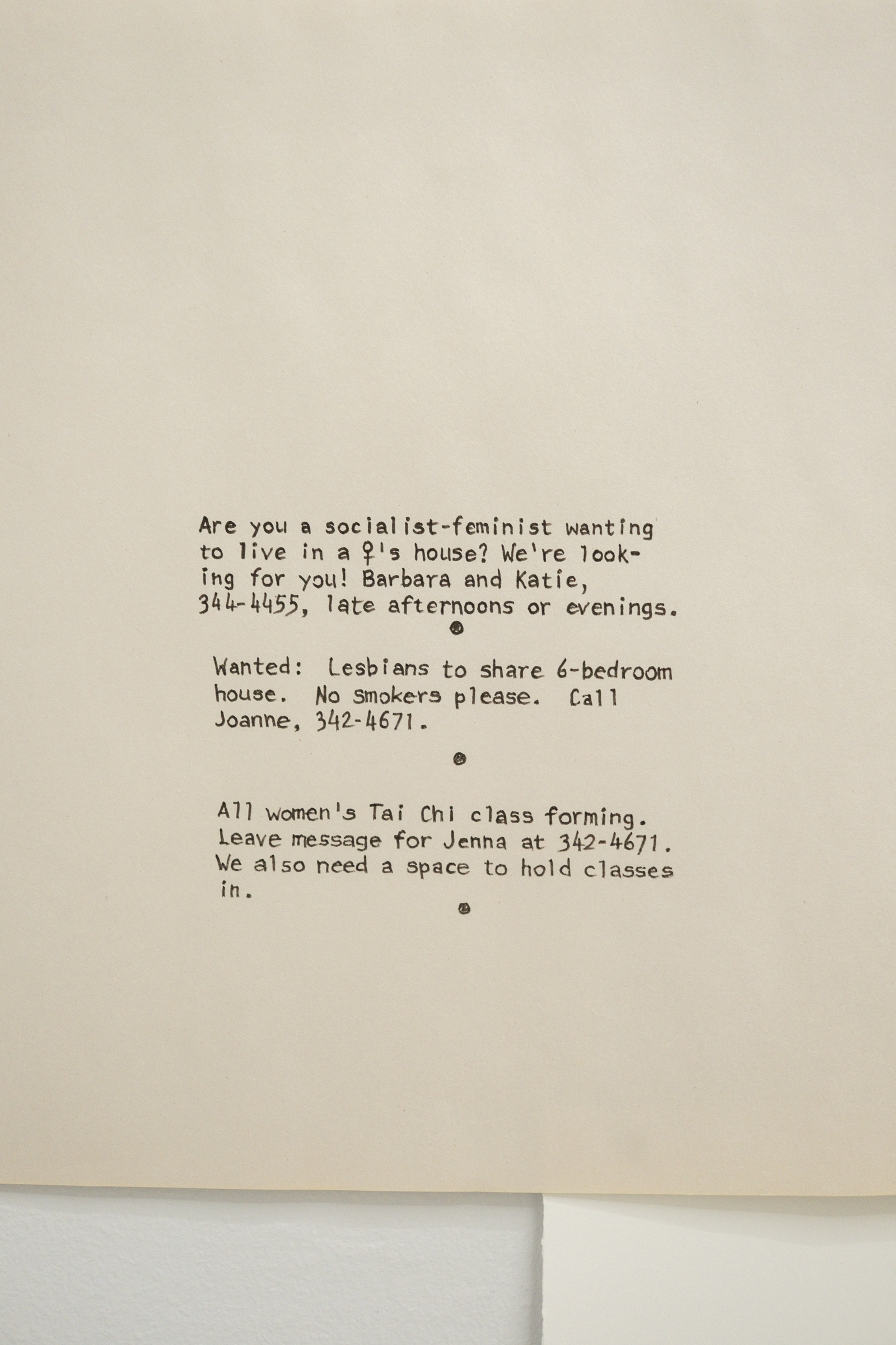 Women’s Press was a feminist newspaper published monthly from 1970-1987 in Eugene, Oregon, USA and was one of the first places that Kaucyila Brooke published her photographs in the early 1980’s. While working on her professional archive, Brooke traveled back to Eugene to view the journals in the special collections of the University of Oregon library and discovered humorous and poignant reminders of the anarchist nature of the Eugene Lesbian Feminist community. For this project she reads through Women’s Press and points to random selections that express the DIY ethos typical of that place and era. By tracing these pull quotes in pen and ink drawings she presents an idiosyncratic snapshot of the publication’s collective editorial approach. These drawings cover the walls of Size Matters as a mnemonic and distracted reading of that local history.