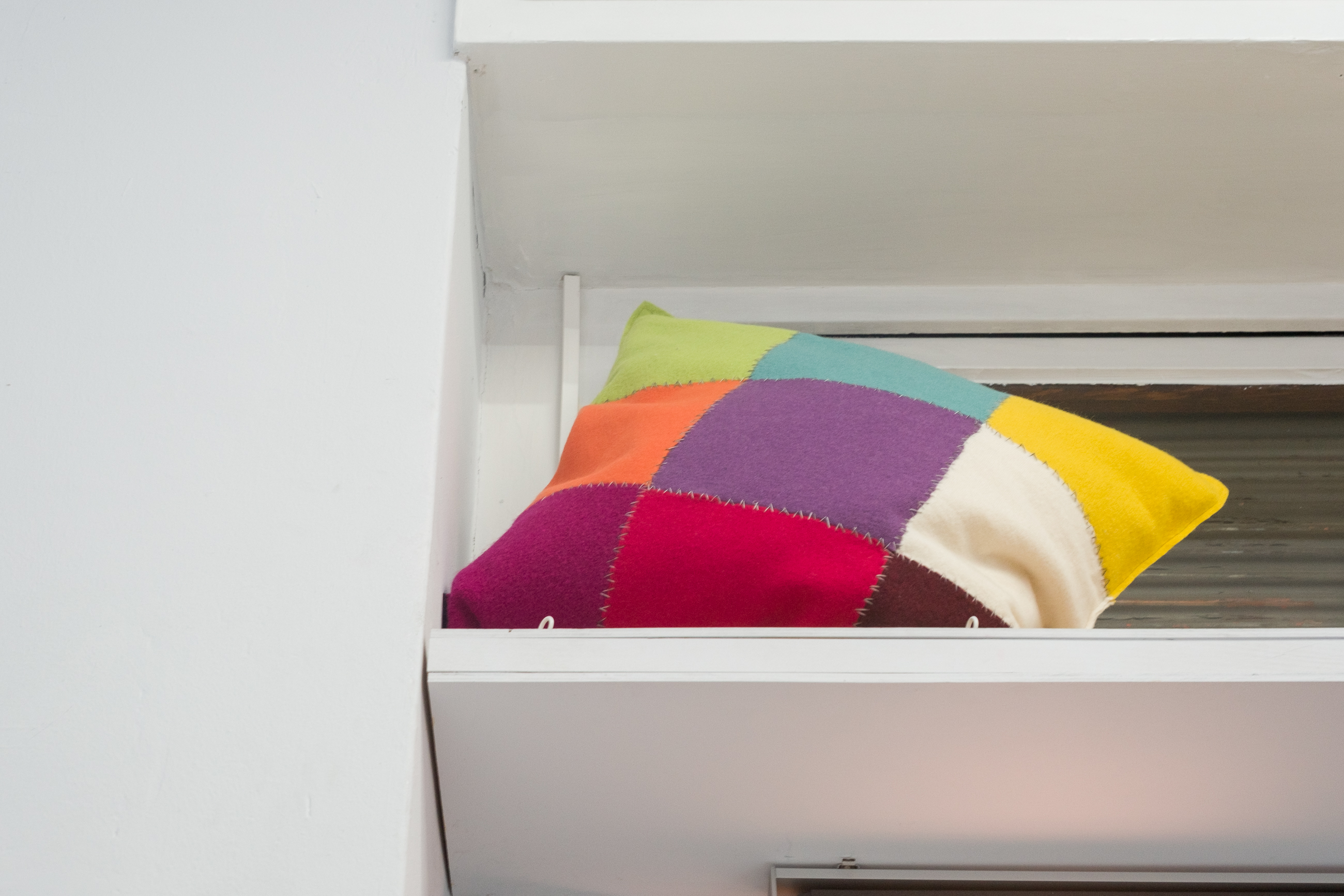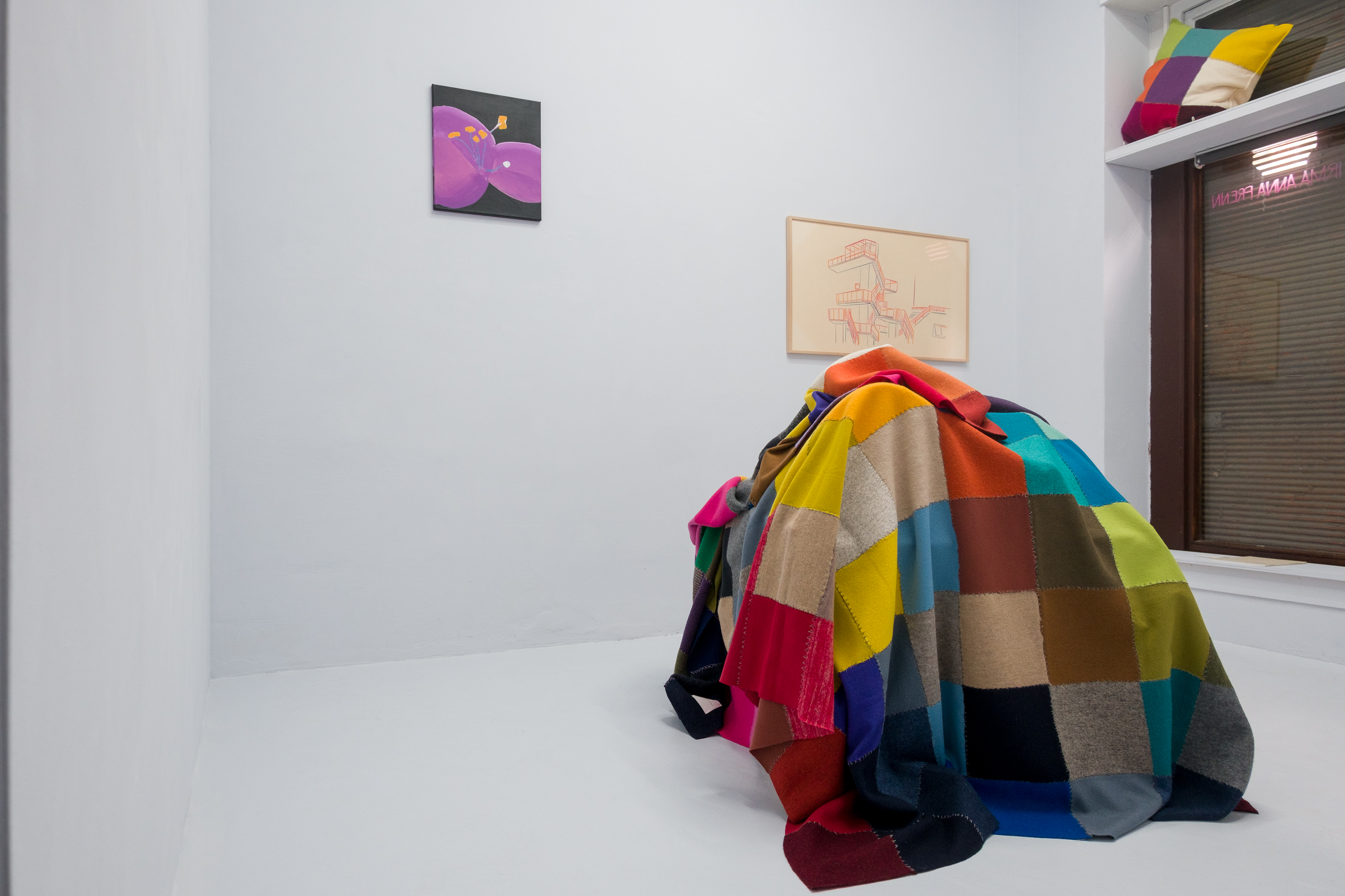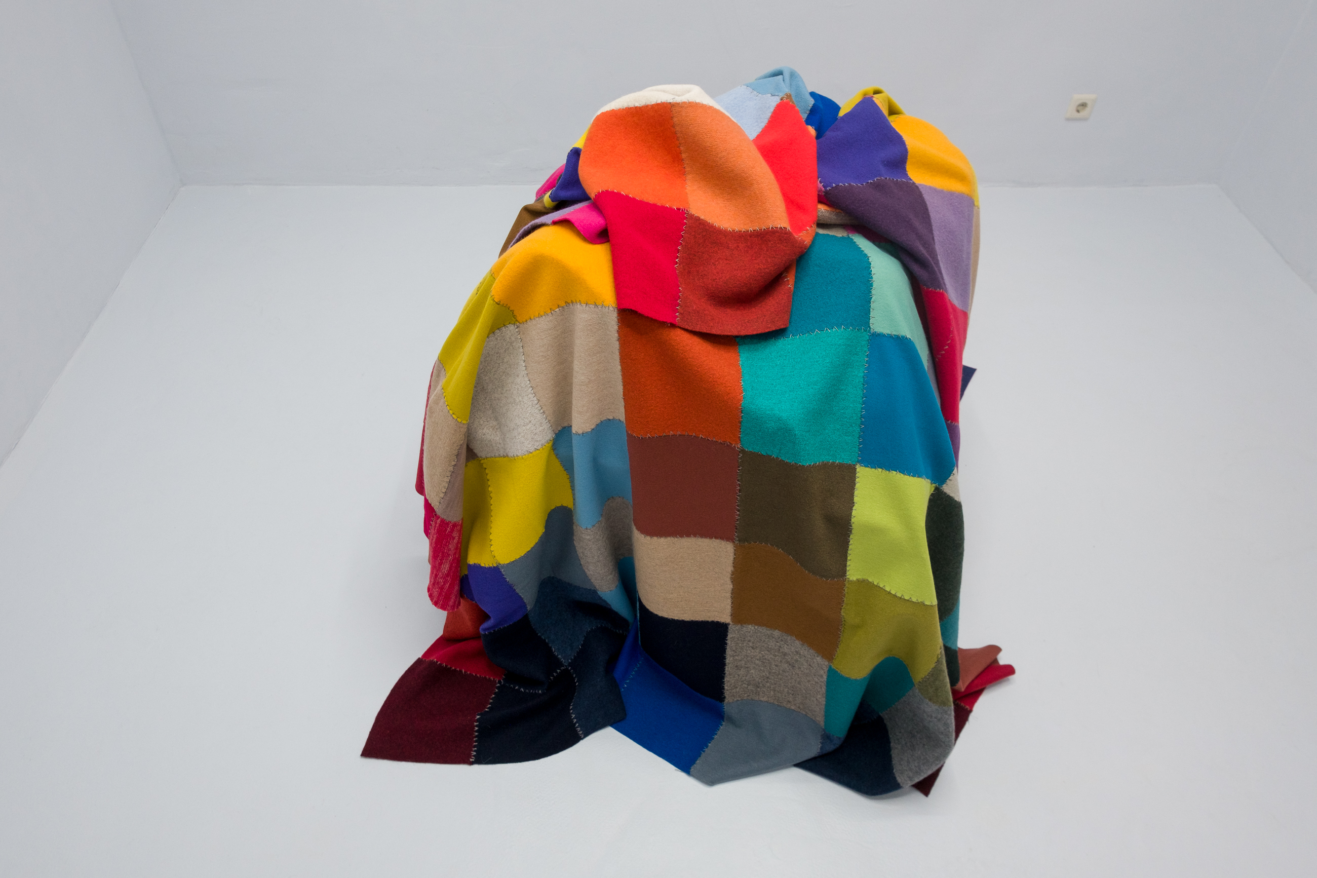 In Prenns textilen Arbeiten manifestiert sich dieser Zustand als ein poetisches Verhältnis zur Fläche. Ihre Stoffbilder aus Wolle entstehen händisch, langsam und schichtweise. Sie bestehen aus Fragmenten, Überlagerungen, sichtbaren Nähten und gestickten Markierungen. Es sind keine glatten Oberflächen, vielmehr fragile Konstruktionen in klaren Farben. Die Bettüberwürfe lassen uns nach der Geborgenheit des Umhülltseins sehnen, nahe am Schlaf und am Träumen, dort, wo es keine Zeit gibt.